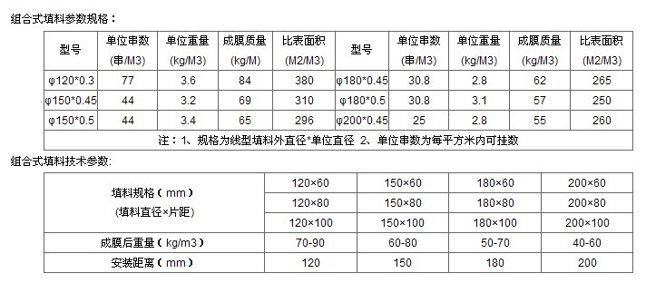组合填料参数规格:单元直径Φ150mm,间距有80mm、100mm两种规格。中心绳有塑料绳及纤维绳两种。组合填料订货须知: 订货请明确所需组合填料的长度、立方数、间距、参数规格等